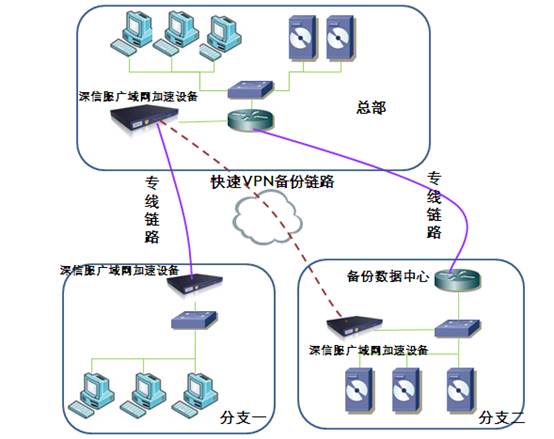 為(wèi)了保障數(shù)據的安全備份,企事業單位除了在總部與備份數(shù)據中心建立專線網絡外,還(hái)可(kě)以在總部、分支端部署深信服廣域網優化設備,形成對專線的快速VPN備份鏈路,并且還(hái)可(kě)以對總部與各分支端之間(jiān)的專線進行(xíng)流量優化。