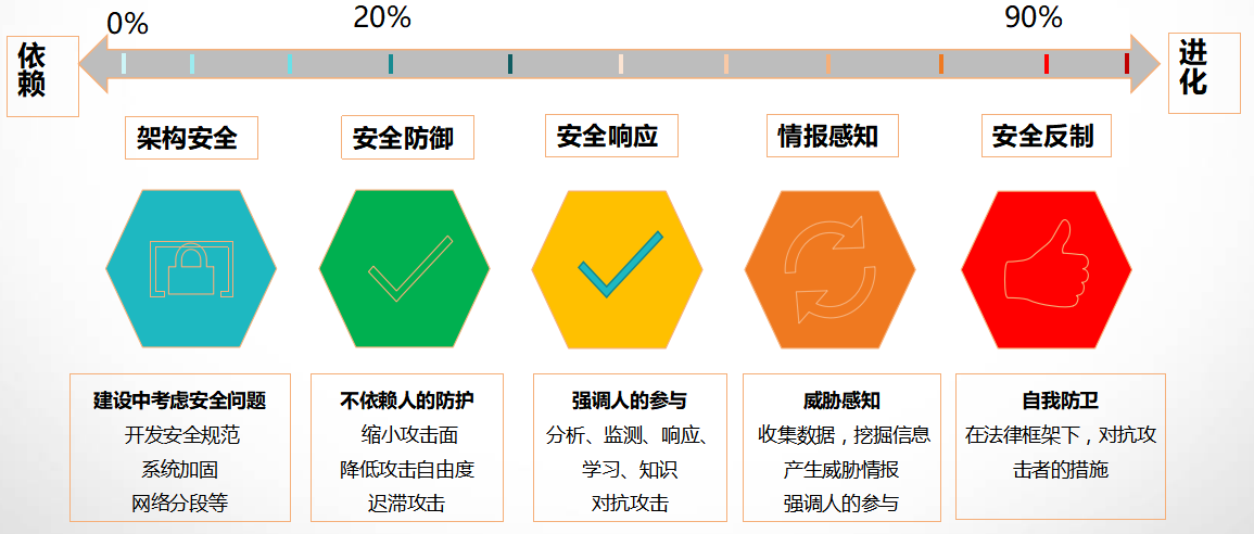 v 第二級,安全防禦:強調安全設備的防護,不依賴于人(rén)的參與。20%