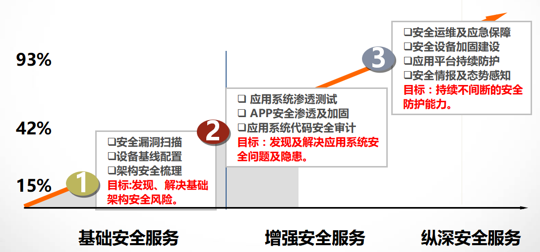 我們的安全服務分為(wèi)三個(gè)等級:基礎安全服務、增強安全服務、縱深安全服務。