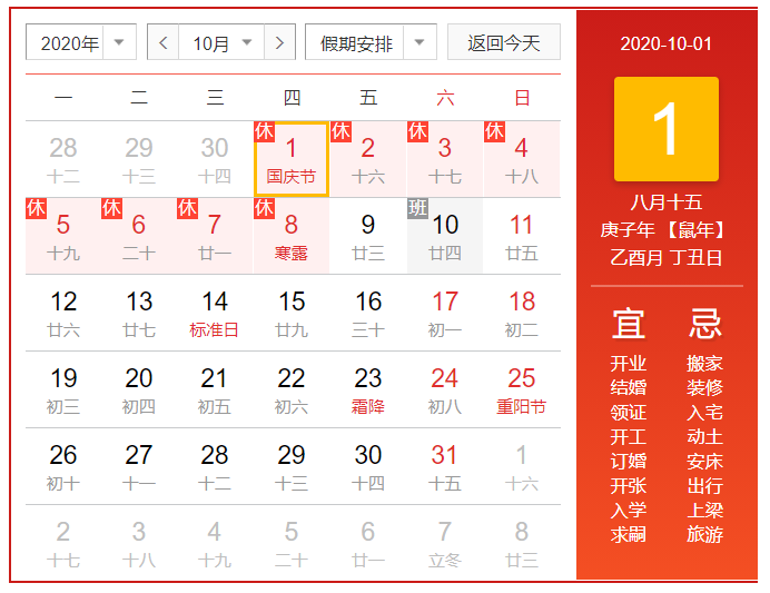2020年10月1日(星期四)至2020年10月8日(星期四)休假,共8天,2020年 10月9日(星期五)正常上(shàng)班。