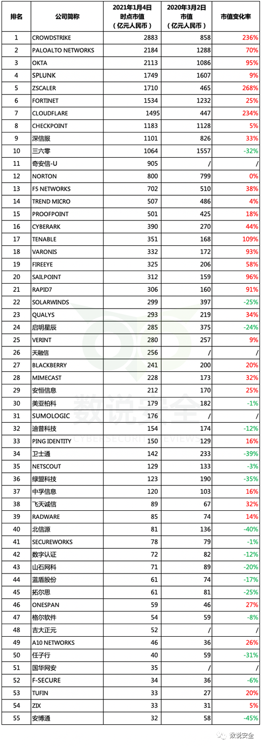 2021開(kāi)年全球上(shàng)市網絡安全公司市值排行(xíng). 2021-01-07